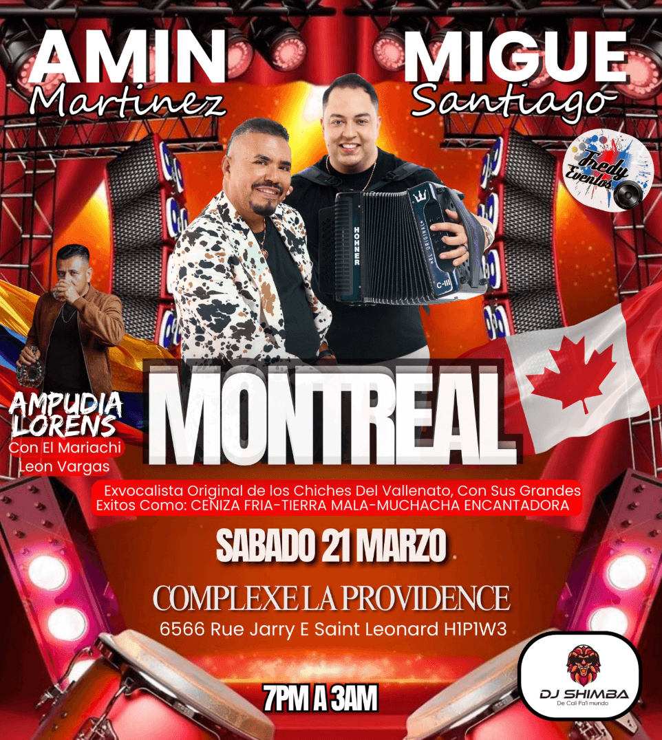 Montreal se prepara para vivir una noche inolvidable con la llegada de Amin Martínez, la voz que marcó una era en Los Chiches del Vallenato, una de las agrupaciones más queridas del género. El artista colombiano se presentará el sábado 21 de marzo de 2026, en Complexe La Providence (6566 Rue Jarry Est, Montréal, QC), en un concierto que promete traer nostalgia, romanticismo y el mejor vallenato para bailar y cantar hasta el amanecer.